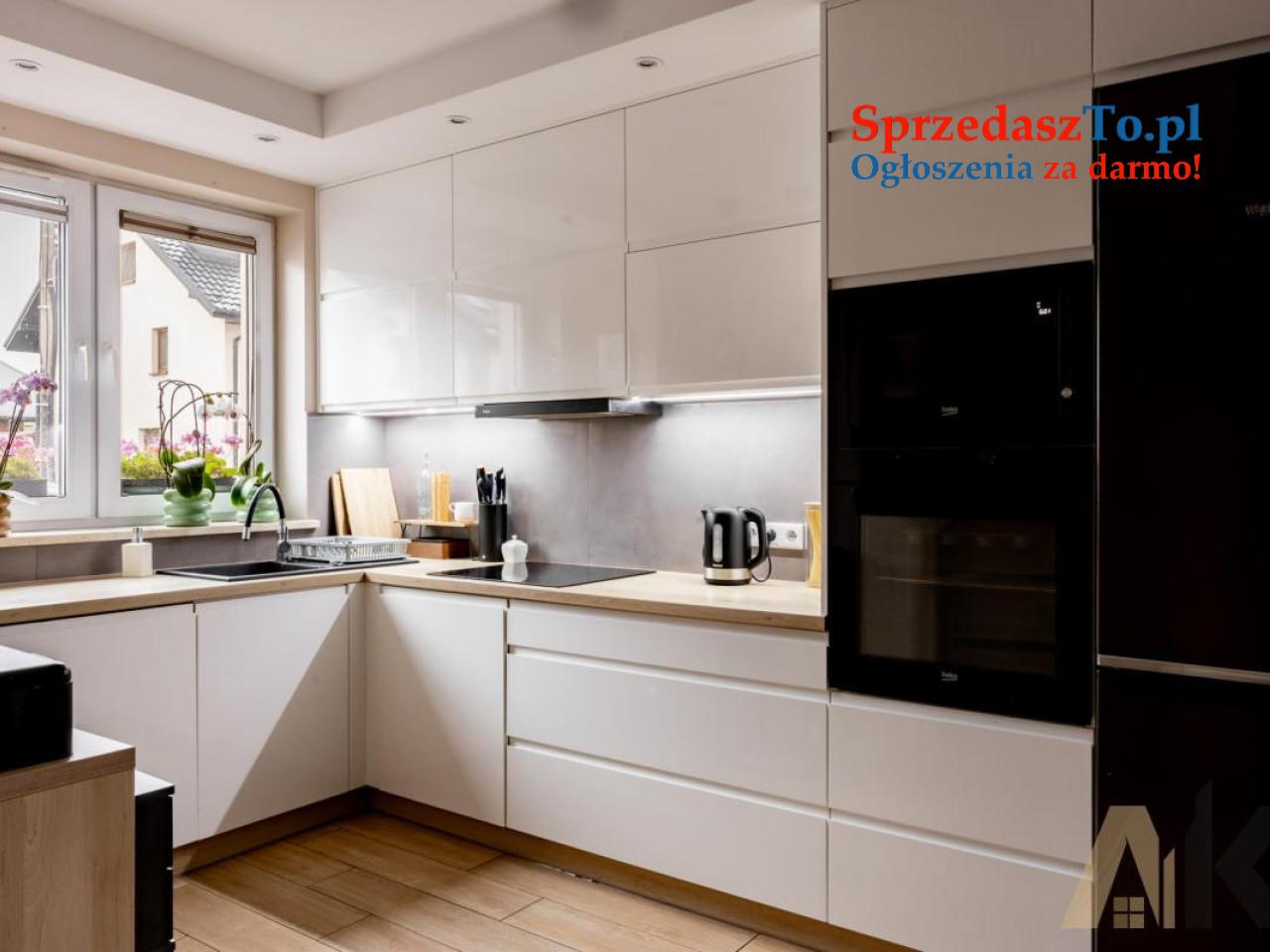Na parterze znajduje się przestronny salon z bezpośrednim wyjściem na taras i środkowy ogródek - idealny do wypoczynku i organizacji rodzinnych spotkań. Kuchnia jest w pełni wyposażona w zabudowę meblową, lodówkę, piekarnik, zmywarkę, okap i płytę indukcyjną. Dodatkowo, na tym poziomie znajduje się stylowa łazienka z prysznicem i WC, spiżarnia i wiatrołap z dużą przesuwną szafą.