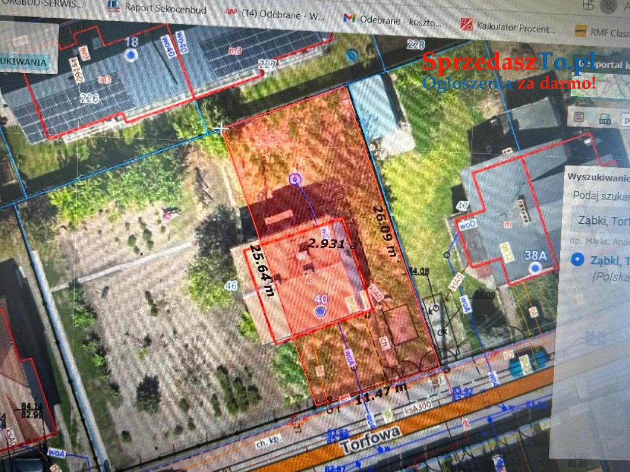 Sprzedam prawo własności do gruntu. Działka budowlana uzbrojona w miejscowości Ząbki na ulicy Torfowej. Powierzchnia działki to 296,625 m2 . Status działki jest uregulowany prawnie. Na działce o łącznej powierzchni 791 m2 stoi budynek parterowy o powierzchni użytkowej 56 m2 (obiekt w przyszłości do rozbiórki). Działka sąsiaduje z ulica utwardzoną, do nieruchomości są doprowadzone przyłącza i podstawowe media, w tym: gaz, prąd, wod.-kan. W przypadku zakupu części działki konieczny będzie podział geodezyjny działki. Zgodnie z miejscowym planem zagospodarowania przestrzennego istnieje możliwość zabudowy mieszkalnej dwukondygnacyjnej z poddaszem użytkowym.