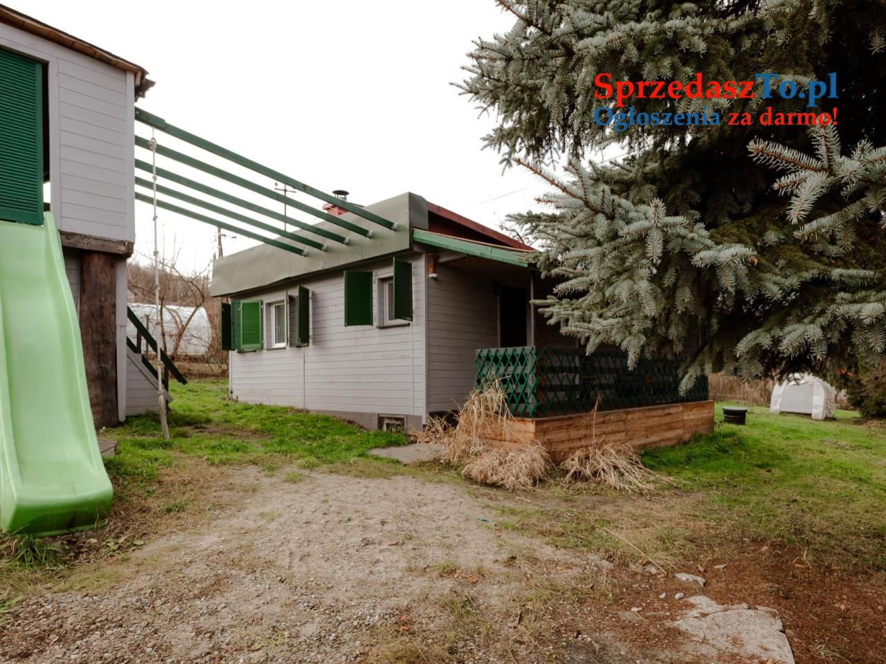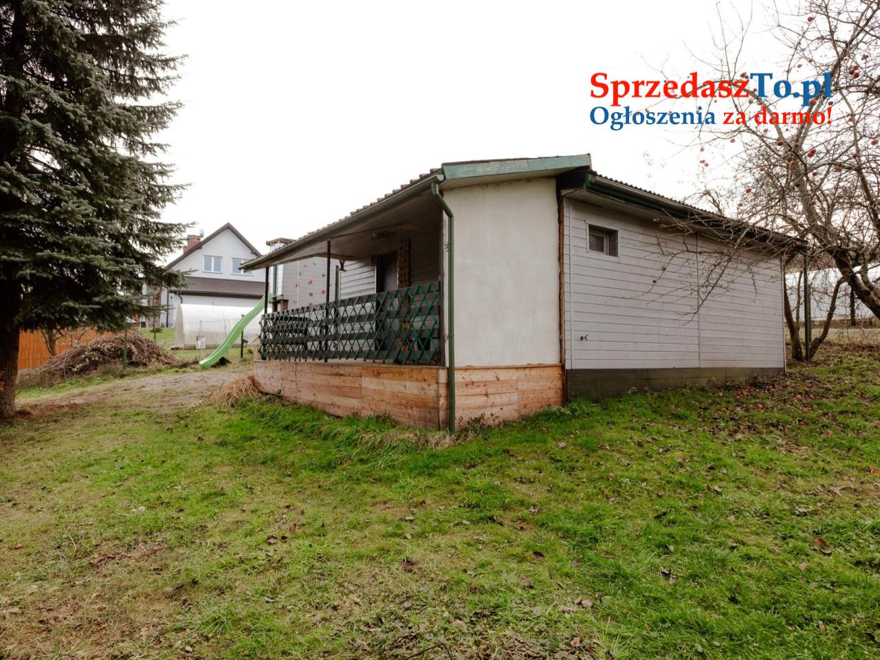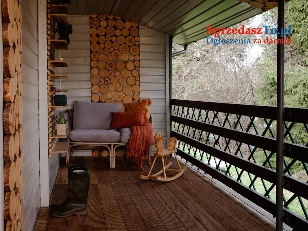 Na działce znajduje się zadbany, drewniany domek o powierzchni 36 m², gotowy do natychmiastowego użytkowania: