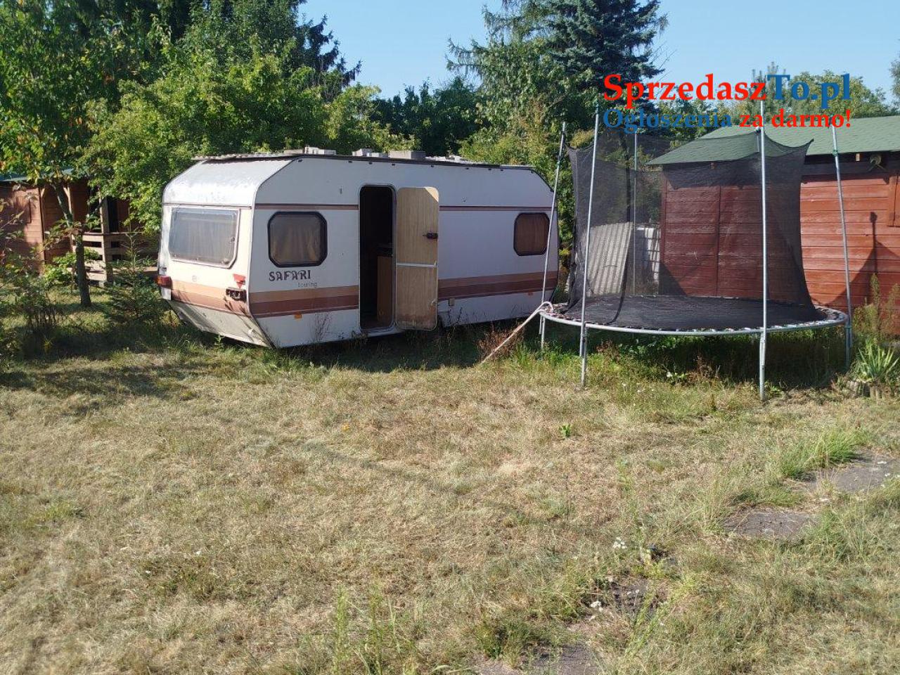Obok stoi przyczepa kempingowa w której można spać. Na działce są różne nasadzenia.