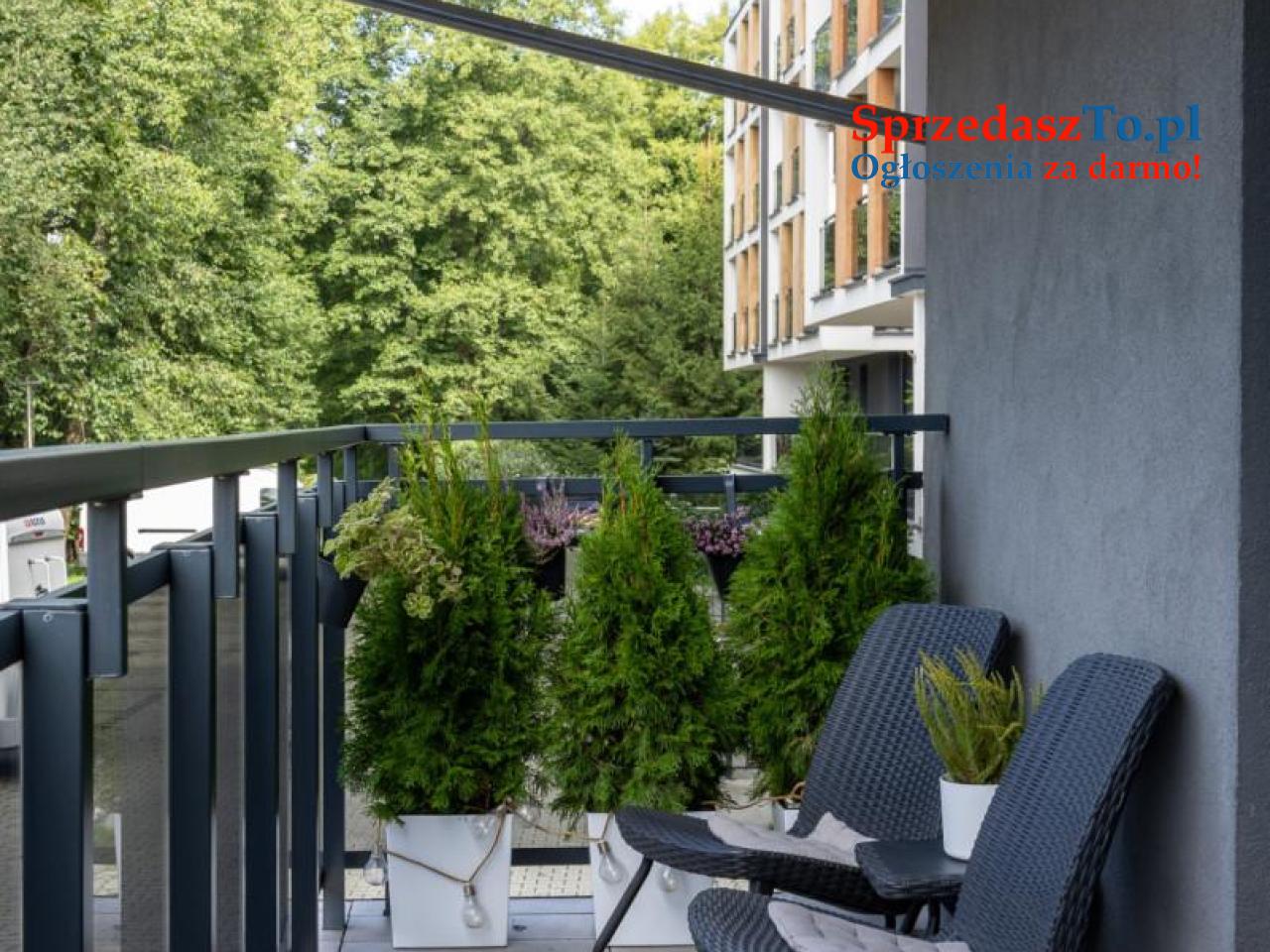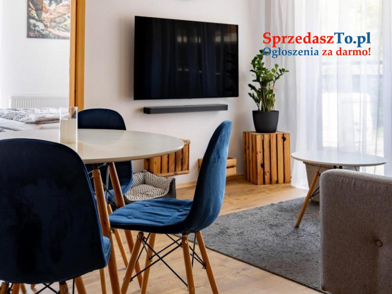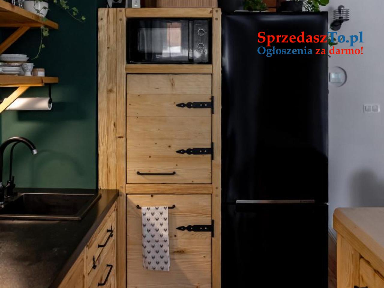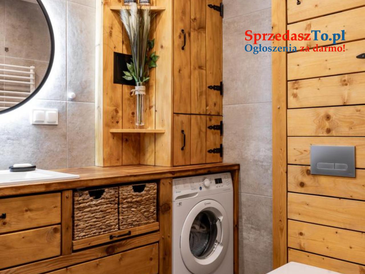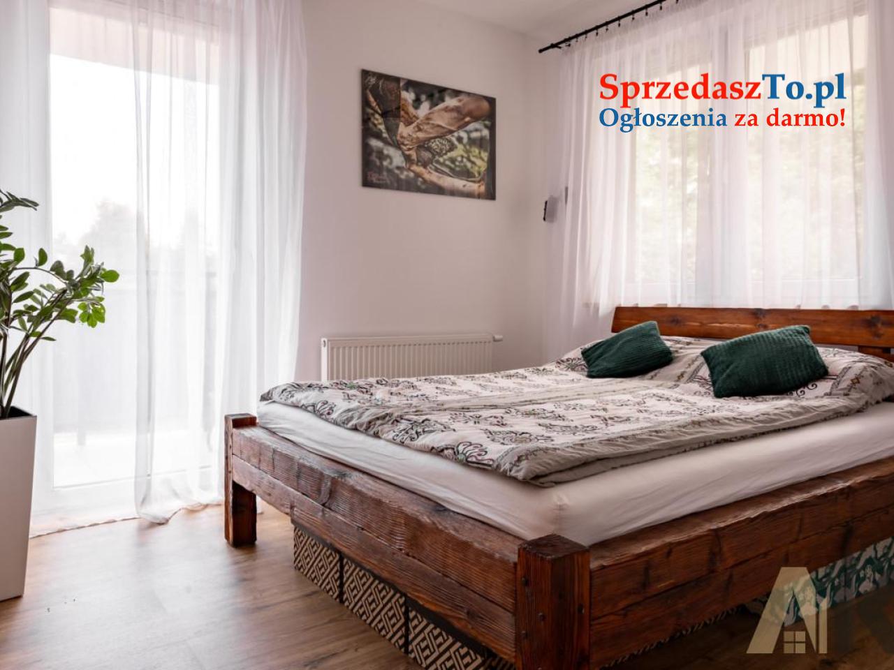Mieszkanie pozostaje umeblowane tj. stała zabudowa w kuchni, szafka RTV, łóżko w sypialni, szafy w zabudowie, szafka umywalkowa i zabudowy w łazience, stół z 4 krzesłami + sofa w pokoju dziennym. Budynek jest z 2018r. w świetnym stanie technicznym. Dodatkowo 2 lata temu został zamontowany zmiękczacz wody. Ogrzewanie gazowe, grzejniki. Materiał wykonania mebli z drewna: sosna olejowana.
